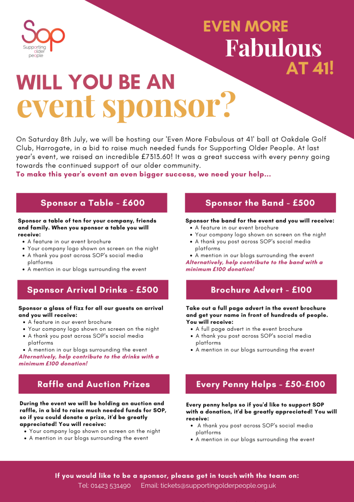 All ticket and sponsorship details are on the poster below and more information is available via email @tickets@supportingolderpeople.org.ukor by telephoning 01423 531490.