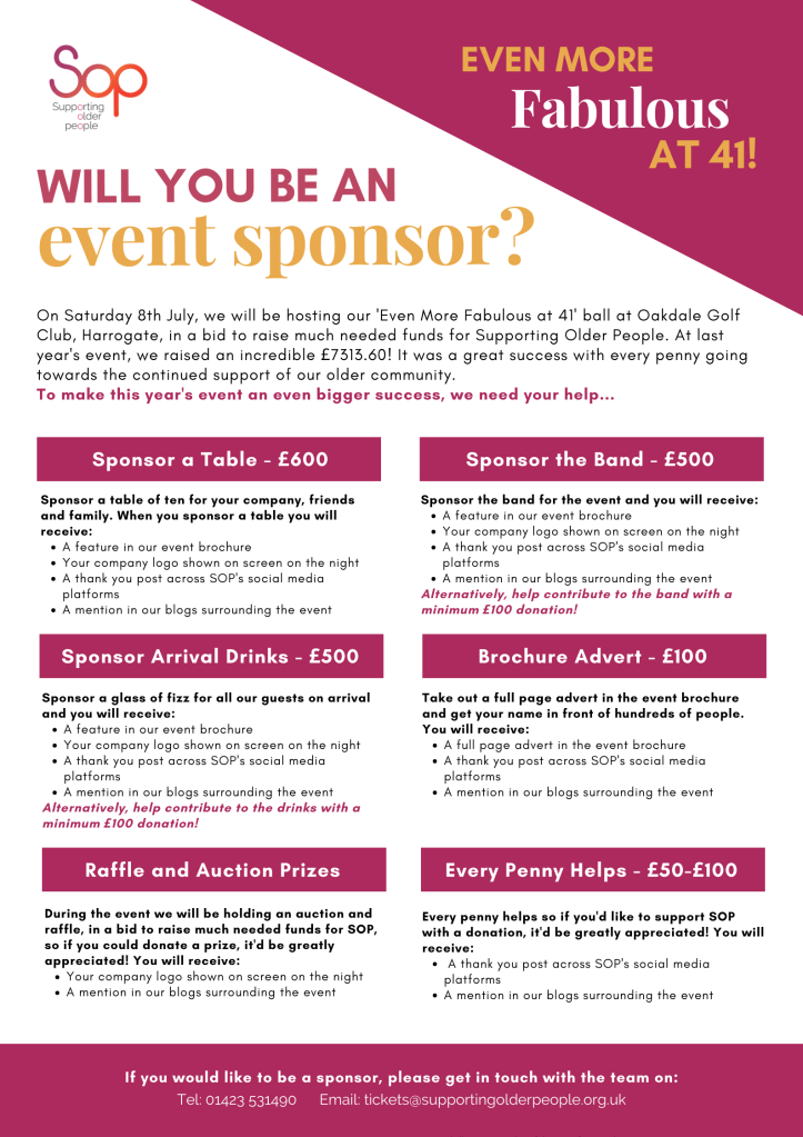 As you all know, SOP are holding their “Even More Fabulous at 41!” black tie event on Saturday 8th July 2023, at Oakdale Golf Club here in Harrogate.